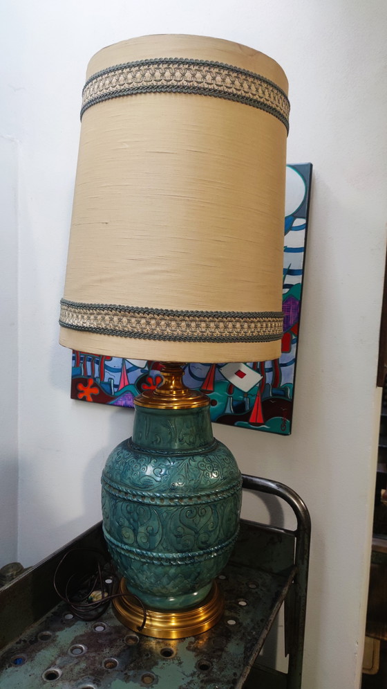 Keramische tafellamp uit de jaren 50. De lamp is in uitstekende staat en wordt geleverd inclusief lampenkap met een prachtige, authentieke bekleding. Afmetingen: 40 x 92 cm.
