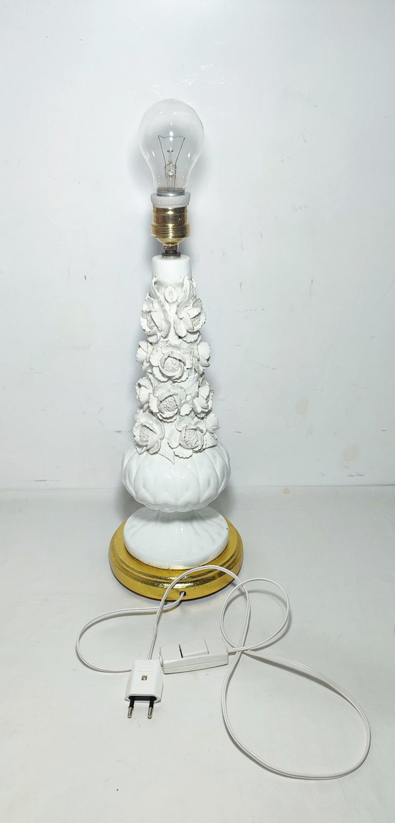 Dit is een charmante vintage keramieken tafellamp uit Manises, Spanje, die dateert uit de jaren 1970. De lamp heeft een ingewikkeld bloemendesign in wit keramiek, aangevuld met een gouden voet. De lamp is een prachtig voorbeeld van Spaans vakmanschap, perfect om een vleugje vintage elegantie toe te voegen aan elke kamer.