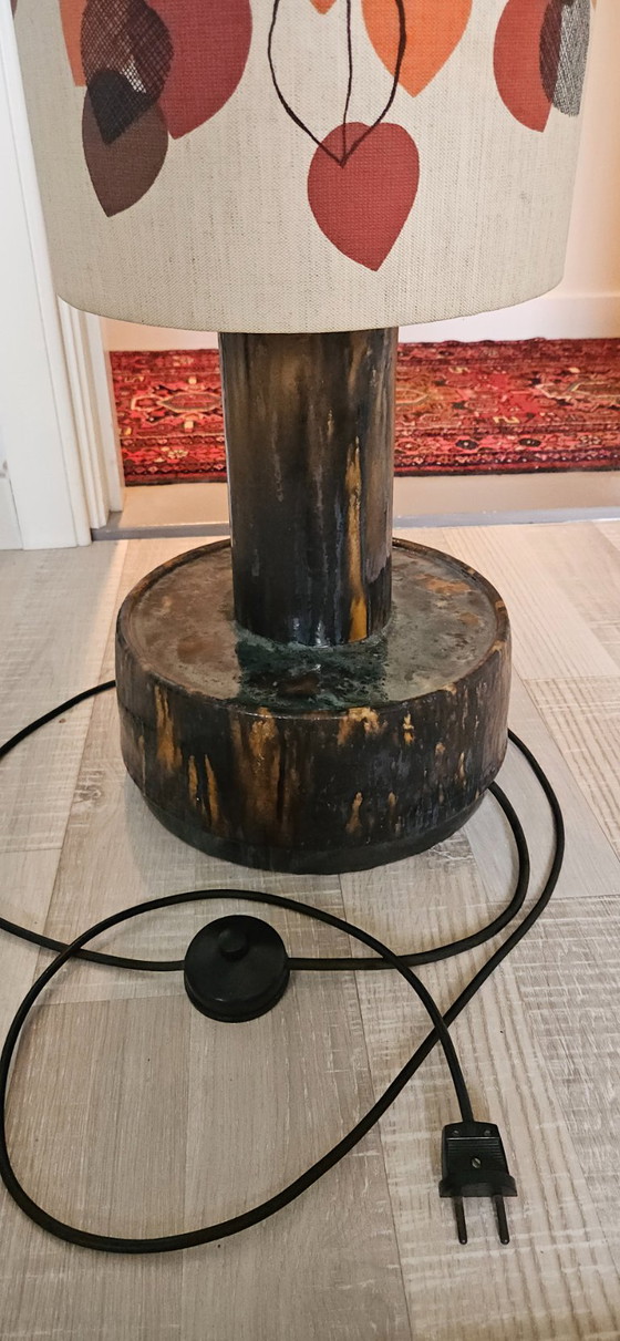 Dit is een charmante vintage keramieken vloerlamp uit de jaren 1960 van Pieter Groeneveldt. De lamp heeft een uniek ontwerp met een stevige keramieken voet en een stoffen lampenkap versierd met een kleurrijk bladpatroon in oranje- en bruintinten. De lamp straalt een warme, retro vibe uit, perfect om een vleugje nostalgie toe te voegen aan elke kamer. De robuuste constructie zorgt voor duurzaamheid, waardoor het een tijdloos stuk is voor vintage liefhebbers.
