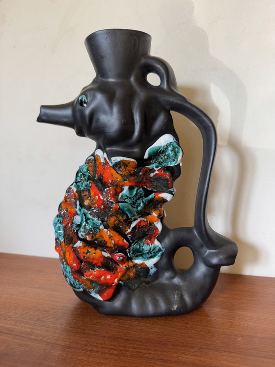 Een zeer mooie zeepaardvormige zoömorfe kruik van Zuid-Frans keramiek uit de jaren 1960, met een mat antracietglazuur en gekleurd email; zeer goede staat.