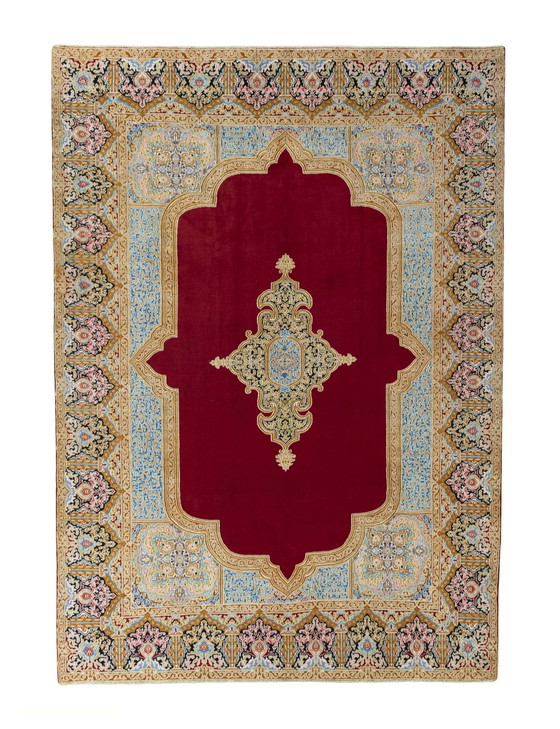Een indrukwekkend Kerman tapijt met een klassiek ontwerp en koninklijke uitstraling. Het levendige robijnrood in het midden wordt omlijst door een prachtige gouden en beige rand met lichtblauwe bloemelementen. Het medaillon in het midden lijkt op een adellijk embleem en geeft het tapijt een bijzondere diepte.
