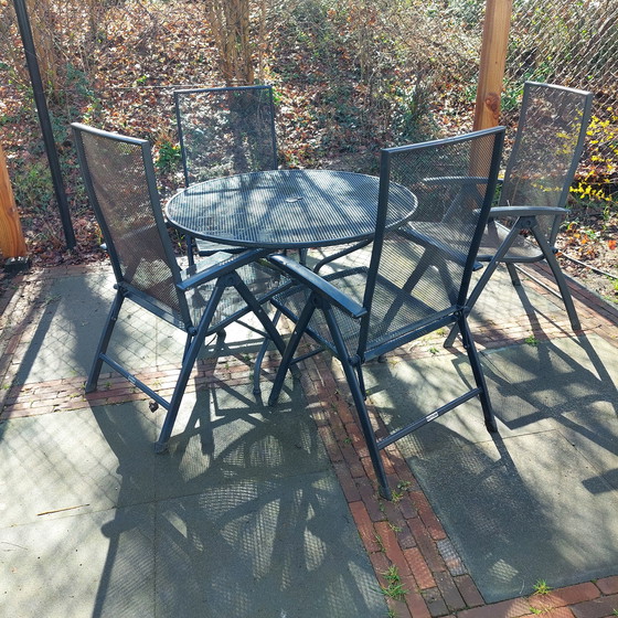 Geniet van gezellige zomerdagen met deze stijlvolle Kettler Siero tuinset. De ronde tafel met een diameter van 105 cm is perfect voor intieme bijeenkomsten en past moeiteloos in kleinere buitenruimtes. De set wordt geleverd met vier verstelbare stoelen, waarvan er twee in uitstekende staat verkeren. De andere twee stoelen zijn nog steeds functioneel, maar vertonen wat gebruikssporen.