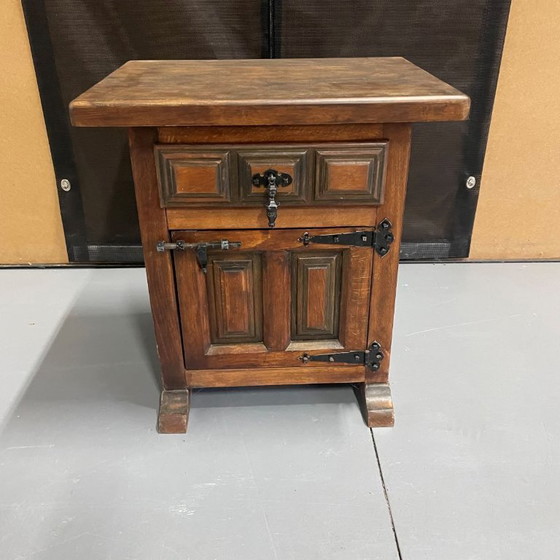 Dit zware kastje is uitgevoerd met dikke wanden en zeer dik bovenblad. De degelijke lade en deur zijn voorzien van zwaar zwart gelakt hang- en sluitwerk.