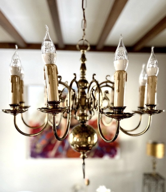 Deze kroonluchter is uitgevoerd in massief messing en heeft een klassiek ontwerp met een warme, landelijke uitstraling. De sierlijke armen en de centrale bol geven de lamp karakter, zonder dat hij zwaar of dominant wordt.