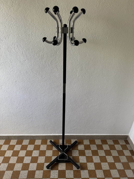 Grote 70's stijl draaibare kapstok in zwart metaal en verchroomd metaal, zwarte polypropyleen koppen; verwijderbare paraplubak; zeer goede staat (enkele lichte ouderdomssporen) Hoogte: 184cm Max. breedte voet: 45cm
