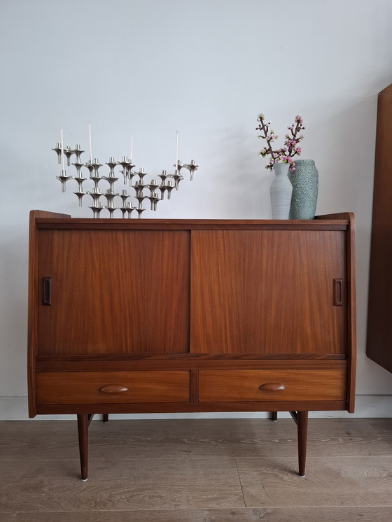 Onder 2 laadjes met houten ronde greepjes. Het kastje staat op stevige conische pootjes.