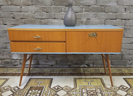 Dit kleine Scandinavische vintage meubel uit de jaren 1970 is een charmante toevoeging aan elk interieur. Het is gemaakt van hout met metalen accenten en heeft een voor die tijd typisch ontwerp met strakke lijnen en taps toelopende poten. Het meubel heeft twee lades en een gesloten compartiment, perfect voor opslag. De warme bruine kleur wordt aangevuld door een blauw bovenblad, wat een subtiel vleugje kleur toevoegt. Ideaal voor wie houdt van retrostijl en functionaliteit.