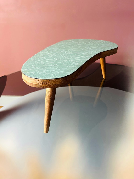 Sfeervol niertafeltje met een elegant organisch gevormd mintgroen formica blad en slanke houten pootjes. Een charmant klein meubelstuk in mid-century stijl. Door het kleine formaat perfect te gebruiken als plantentafeltje, laag bijzettafeltje of decoratief accent op een dressoir of vensterbank. De combinatie van het frisse pastelgroen en het warme hout zorgt voor een tijdloze uitstraling.