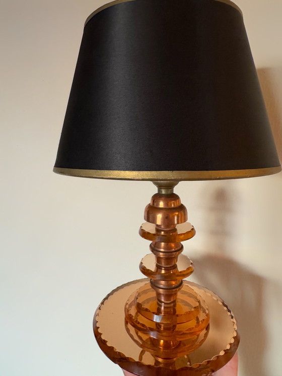 Kleine Art Deco stijl en antieke tafellamp in verkoperd en facet geslepen glas en originele zwarte zijde en papieren kap; goede staat (een lichte chip op het glas en tekenen van ouderdom op de kap: zie foto's), voor bajonetlamp.