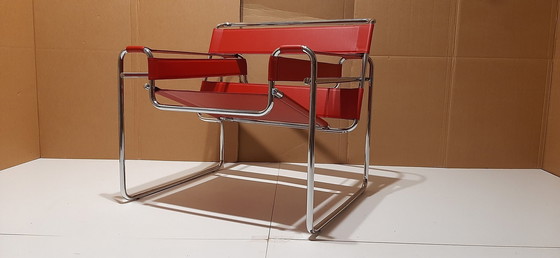 SCHITTEREND NIEUW-NOOIT GEBRUIKT Wassily B3 fauteuils van Knoll, ontwerp van Marcel L. Breuer, model ontworpen in 1925 (Bauhaus Project n3 ). KNOLL Studio serie. Bekleding in dik rood leer. Dit is een exemplaar in UITSTEKENDE staat. Dit iconische meubel is gloednieuw en nooit gebruikt. Het is alleen uit de doos gehaald voor de Sale fotoshoot. De meegeleverde thermoplastische antislipknoppen moeten nog worden aangebracht. Voor een betere garantie voor de eindgebruiker is de structuur van de stoel in contact met de vloer beschermd met een transparante fotografische film. Het leer en staal zijn uiteraard in uitstekende staat. NB: NIEUW-NOOIT GEBRUIKTE fauteuils. De meegeleverde antislipnoppen van hard thermoplastisch materiaal moeten nog worden aangebracht. Afmetingen van pakket/nek L80xB80xH75 cm