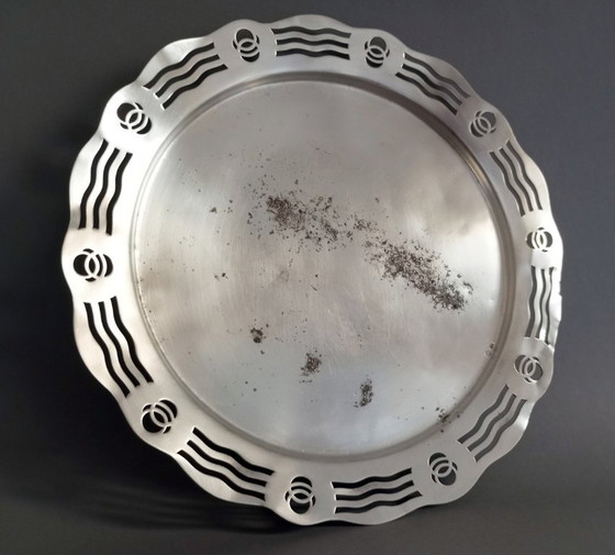 Koloman Moser secessionistisch/verzilverd bord voor Argentor 1902 Wenen - 35 centimeter, gemerkt. Lichte vervormingen, slijtage en ouderdomsverschijnselen. Bij Christie's in Engeland werd in 2002 een stuk van Koloman Moser met hetzelfde patroon geveild - zie laatste foto.