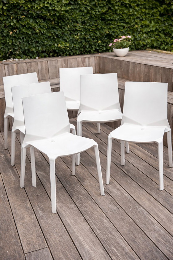 Set van 6 moderne design stoelen van het merk Kristalia. Tijdloos Italiaans design met een strakke, minimalistische uitstraling.