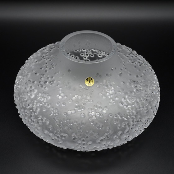 Met zijn dikke en stevige structuur heeft de vaas een gedeeltelijk gestructureerd glazen oppervlak, wat zijn aantrekkingskracht nog benadrukt. Het delicate "P" merkteken van de fabrikant siert de basis, een bewijs van de herkomst en authenticiteit.