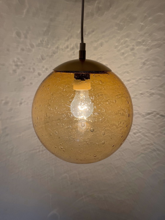Prachtige gebobbelde amberkleurige glazen bol en vergulde metalen voet, jaren 70, Peill & Putzler stijl, uitstekende staat, voor grote inschroefbare lamp Diameter: 25cm Snoerlengte: 50cm (naar beneden verstelbaar) 12 stuks beschikbaar; eenheidsprijs Snelle, zorgvuldige verzending