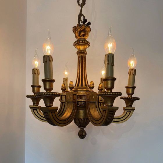 Elegante 6-armige kroonluchter in Lodewijk XVI stijl uit de jaren 50 en 60 in verguld houtsnijwerk; zeer goede staat; voor kleine schroeflamp Hoogte kroonluchter alleen: 47cm Totale hoogte met ketting: 88cm (naar beneden verstelbaar) Spanwijdte: 48cm