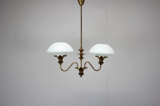 - Kroonluchter van messing uit het midden van de vorige eeuw, van de glasfabriek Jablonec, jaren 70, Tsjecho-Slowakije,