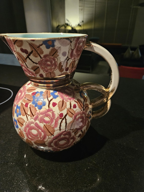 ConditieHeel goedKleurenRoze, Blauw, Crème, GoudMateriaalKeramiekAantal stuks11e eigenaarJaHoogte23 cmBreedte16 cmDiepte16 cm