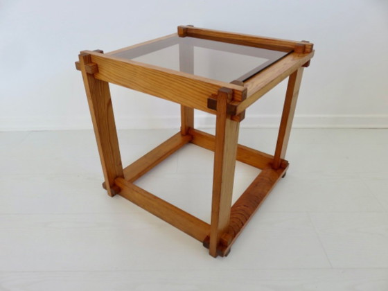 Kubustafel van grenenhout en rookglas van Jan Slothouber & William Graatsma. Eind jaren 60. De tafel verkeert in goede staat met zeer geringe gebruikssporen. Afmetingen: 45 x 45 x 45 cm.
