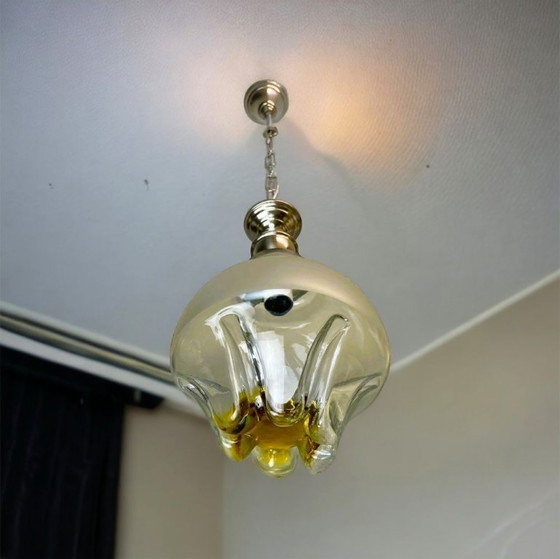 Deze hanglamp is met passie en precisie vervaardigd uit kunstglas in Mazzega-stijl en is een bewijs van de artisticiteit en creativiteit van zijn tijd.