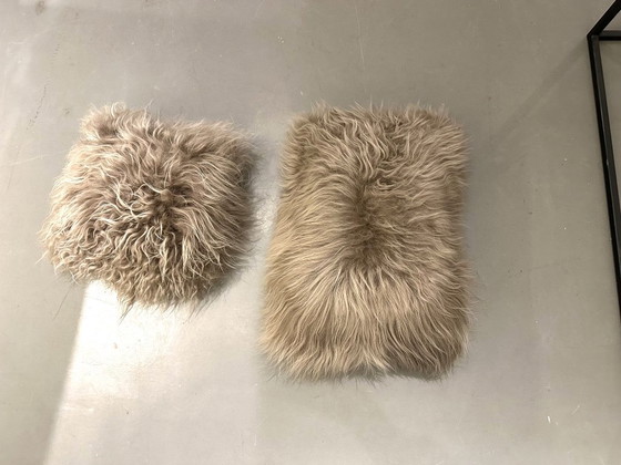 Schapenvacht kussens 2 stuks langwerpig en vierkant, de binnenvacht is bruin en loopt uit naar beige. Lange schapenvacht, mooi in goede staat. Afmeting lange kussen 40 x 60 cm en kleine kussen 40 x 40 cm.