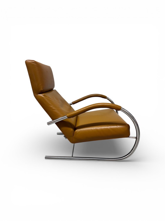 Deze uitvoering is voorzien van een cognac leren bekleding en een stevig licht verend frame van geborsteld staal. Het ergonomische ontwerp biedt luxe, duurzaamheid en een fantastisch zitcomfort. Het is dan ook een sieraad in uw huiskamer.