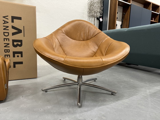 Nieuw in doos! Label hidde draai fauteuil uitgevoerd in bovino leder in de kleur naturel met geborsteld chroom onderstel. Afm l94xd94xh87 zh40 zd49cm