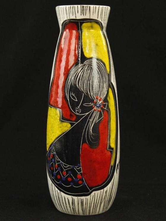 Wij bieden een keramieken vaas met een zogenaamd 'Titano meisje', ergens in de jaren 50-60 vervaardigd in de Italiaanse Albisola-regio.