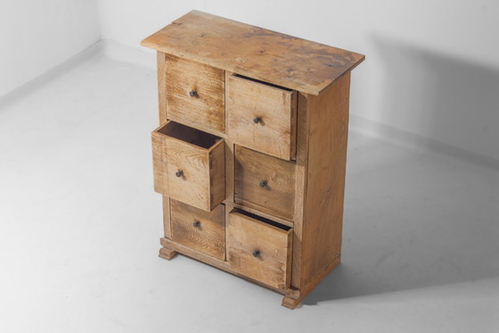 Deze massief houten ladekast komt uit landelijk Frankrijk en dateert uit het begin van de 20e eeuw. Hij heeft zes lades met sierlijke ijzeren knoppen en een natuurlijk, verweerd oppervlak dat de leeftijd en het gebruik ervan laat zien. De eenvoudige constructie weerspiegelt de praktische stijl van Art Populaire-meubels, gemaakt voor het dagelijks leven in boerderijen en dorpshuizen.