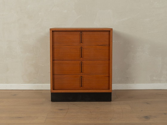 Prachtig dressoir uit de jaren 1960 van Günter Renkel voor Rego Möbel. Corpus in teakfineer met vier laden en een zwart contrasterend onderstel. Gemaakt in Duitsland. Ontwerp: Günter Renkel, fabrikant: Rego.