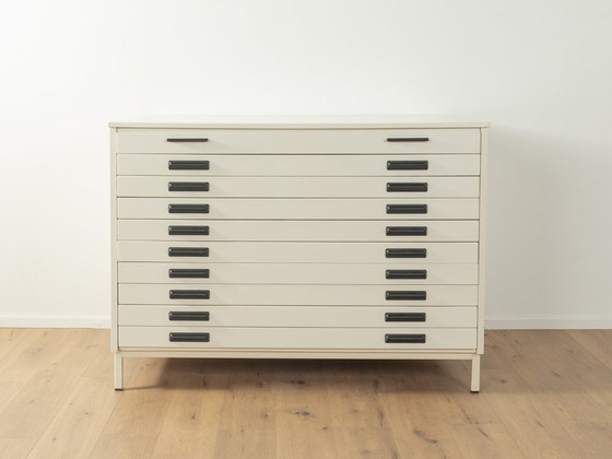 Prachtige ladekast uit de jaren 50. Hoogwaardige kast van wit gelakt blokplaat met tien laden en vierkante stalen poten in wit.