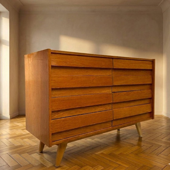 Ontworpen door Jiří Jiroutek, model U-453, en geproduceerd door Interiér Praha in Tsjecho-Slowakije in de jaren 60. Onderdeel van een bekende modulaire meubelserie die bekend staat om zijn eenvoudige en efficiënte ontwerp.
