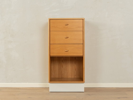 Klassieke ladekast uit de jaren 1980. Corpus in eikenfineer met drie laden en een nieuw onderstel in crèmewit. Gemaakt in Duitsland. Ref 2312015