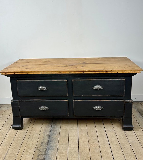 Lage ladekast van massief grenenhout, afgewerkt met een elegante, licht verweerde zwarte patina die het meubelstuk karakter geeft. Het natuurlijke houten blad contrasteert perfect met het donkere frame en zorgt voor een warme en tijdloze uitstraling. De gebruikssporen en de natuurlijke onregelmatigheden van het hout benadrukken de authenticiteit.