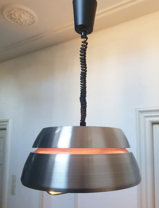 Lakro Space Age hanglamp - Midcentury hanglamp van Lakro Amstelveen. De lamp is gemaakt van staal en heeft een paarse lak van binnen. De lamp heeft nieuwe E27 fitting.