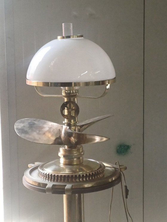 Dompel jezelf onder in de nautische charme van deze prachtige lamp, vervaardigd uit massief messing en versierd met gedetailleerde propeller- en tandwieldetails. Deze lamp is niet alleen een lichtbron, maar ook een echte blikvanger met een gewicht van maar liefst 25 kg, wat zorgt voor stabiliteit en een aantrekkelijke uitstraling in elke kamer. Met een hoogte van 70 cm, een breedte van 53 cm en een glasdiameter van 40 cm is hij een perfect middelpunt voor uw maritieme interieur.