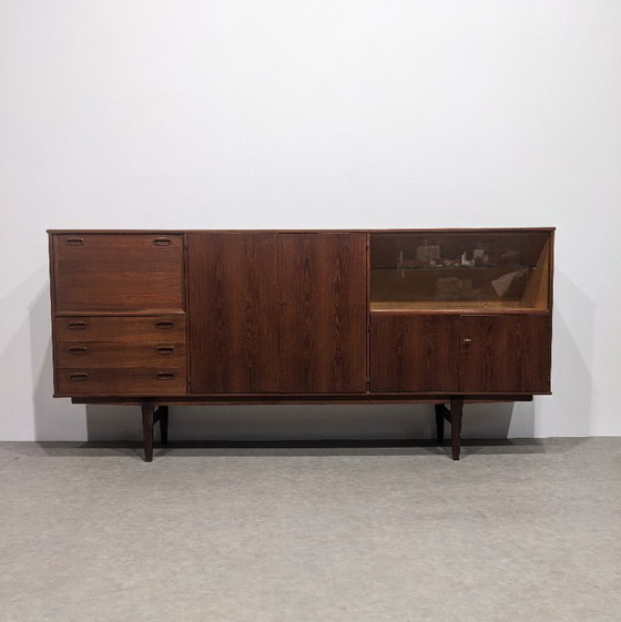 Bar, vitrinekast, drie lades, twee opbergvakken.
