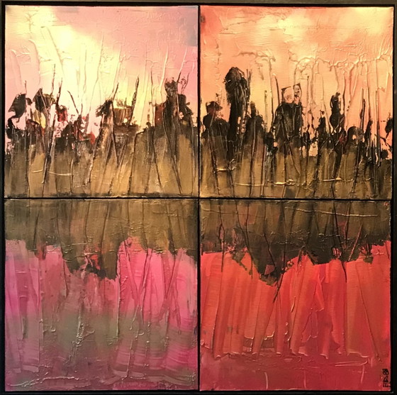 Larkspur (Ridderspoor) is een schilderij van EllesBB dat is gemaakt in Mei 2019. Het is een samenstelling van 4 doeken van linnen van 50 x 50 cm.In totaal 100 x 100 in een zwarte baklijst(zie foto). Mixed media op linnen.