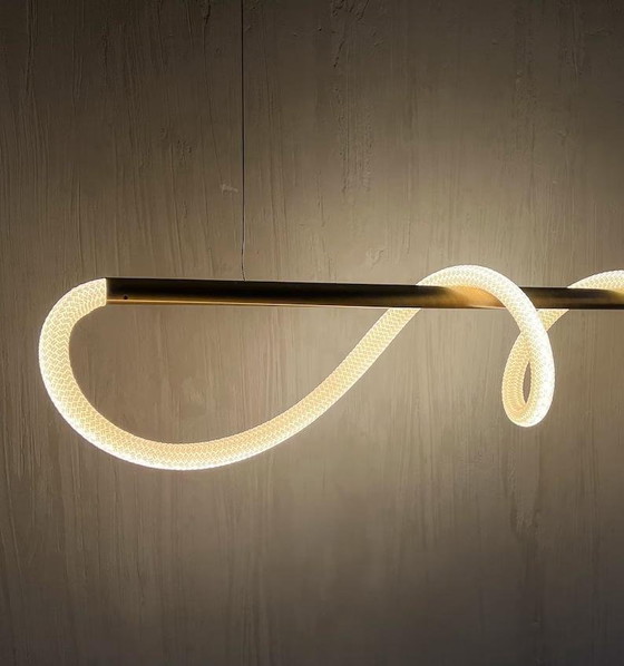 Moderne LED hanglamp met een strak en golvend design van 120 cm breed. De lamp hangt aan twee zwarte plafondbevestigingen en heeft een minimalistische, stijlvolle uitstraling. Perfect als blikvanger boven een eettafel, kookeiland of in een moderne woonkamer.