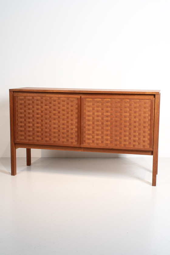 Leo Bub dressoir voor BUB Wertmøbel. Een prachtig strak dressoirtje met gevlochten fineer deurtjes.1 Plank ontbreekt maar de plannendragers zitten er wel in. Verder is deze kast in een goede vintage staat.