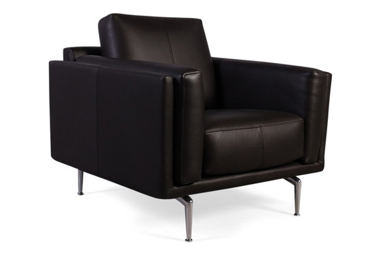 Fauteuil Bellice + poef 100x57 van Leolux / geheel in leder Negev 210 Nervio / poten Grazio aluminium gepolijst / fauteuil afm. 88x88x83hg, poef afm. 102x58x41hg