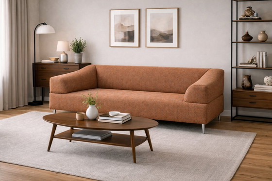 Prachtige Leolux Laya Lobi bank in een warme terracotta/oranje stof. Een echte designbank van Nederlandse topkwaliteit, met het herkenbare comfort en de verfijnde afwerking waar Leolux om bekend staat.