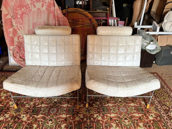 De stoelen zijn goed gebruikt. Het witte leer toont veel gebruikerssporen. Maar nog niet kapot. Ze kunnen wel een schoonmaakbeurt gebruiken. Ze staan opgeslagen op een zolder in Brabant. Waar ze in overleg kunnen worden opgehaald.