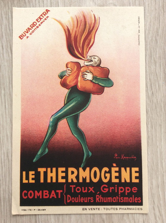 Originele offsetlithografie uit 1940: 'Le Thermogène combat Toux, Grippe, Douleurs Rhumatismales'.