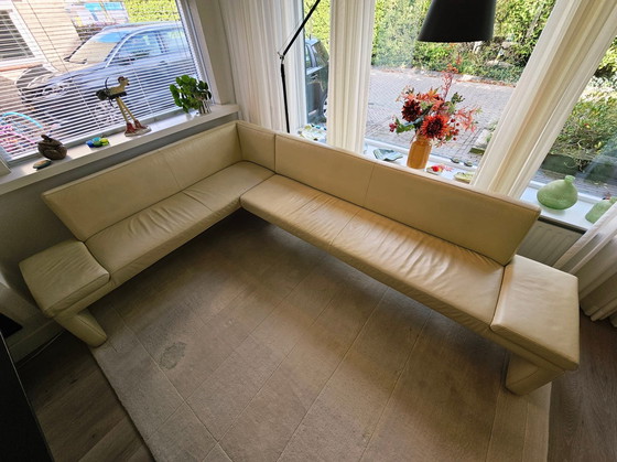 Mooie ruime crèmekleurige leren eethoekbank Valerius van Nova Style collection.