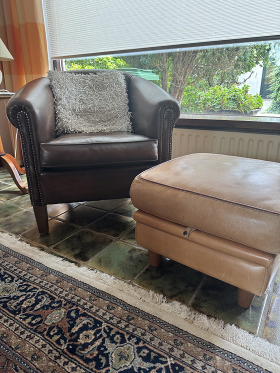 Leren fauteuil in goede staat. Nieuwprijs was €1295,-. De afmetingen zijn: Hoogte 80 cm, Breedte 78 cm, Diepte 82 cm. Inclusief bijpassende voetenbank.