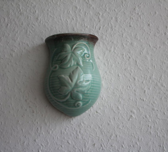 Lichtgroene vintage keramische wandvaas met wijnrankdecoratie.