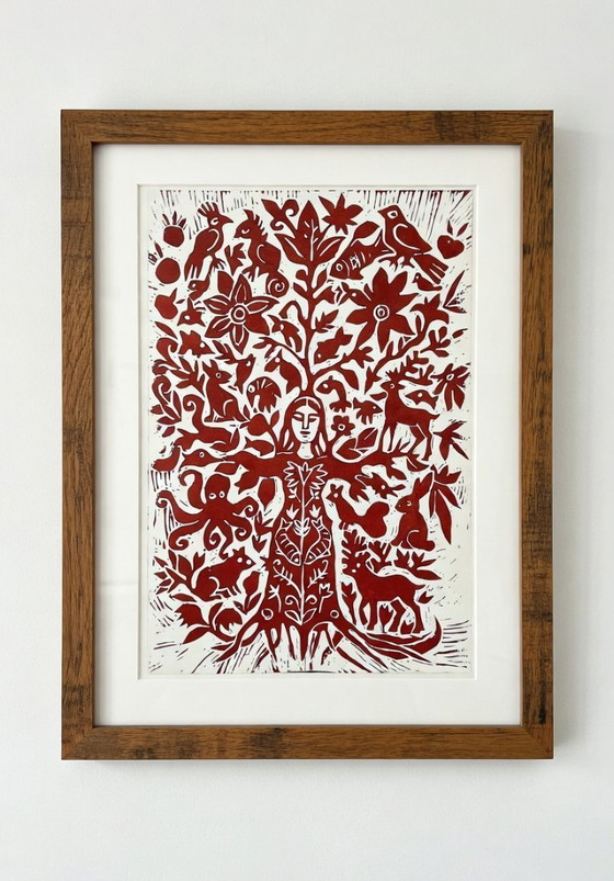 "Boomvrouw" is een symbolische linosnede, met de hand gesneden en met zorg gedrukt.
