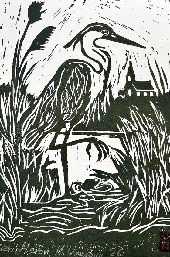 Originele handgedrukte linosnede van een grijze reiger in een Nederlands moeras - riet, een kikker in het water en een kerksilhouet in de verte. Gedrukt met diepgroene inkt op wit papier. Krachtig, sfeervol en vol details. Elke prent is uniek - de natuurlijke sporen van het gereedschap maken elk exemplaar uniek.