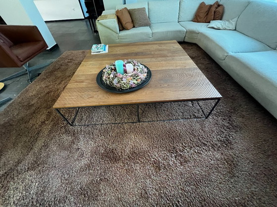Linteloo salontafel "Log" 140cmx140cmx 32 cm hoog in eiken naturel. Het blad is voorzien van gefreesde jaarringen wat de Log salontafel een bijzondere uitstraling geeft.