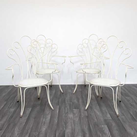 Een elegante set van vier tuinstoelen, toegeschreven aan Lio Carminati, vervaardigd uit wit geëmailleerd smeedijzer. Een verfijnd voorbeeld van jaren 50 design, gekenmerkt door vloeiende, lichte lijnen die doen denken aan florale en natuurlijke motieven, typisch voor het Italiaanse modernisme.